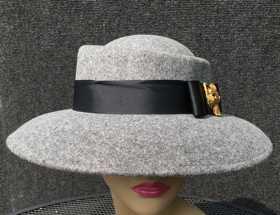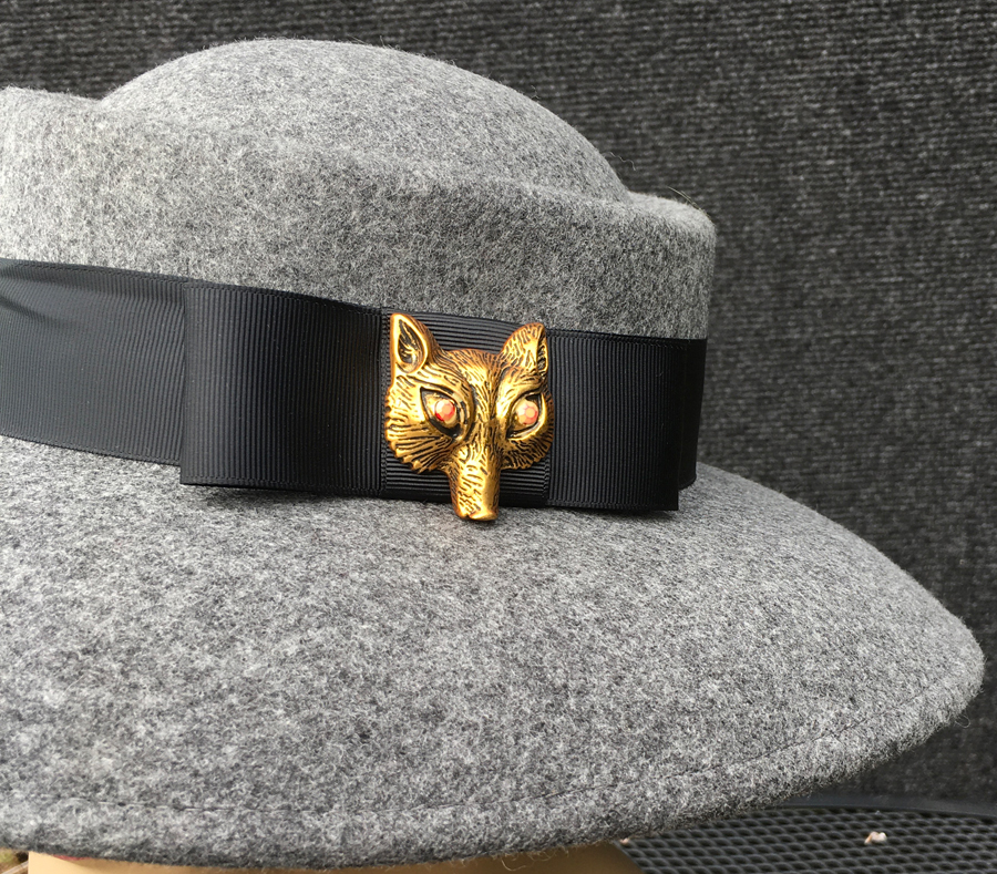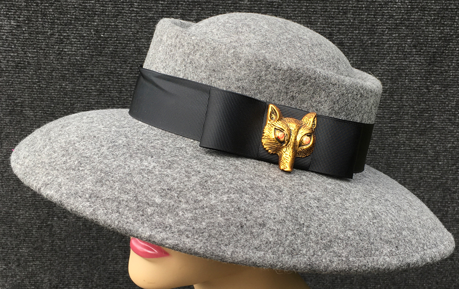 A brass colored fox mask with red eyes highlights this generously brimmed felt hatm trimmed in black grosgrain and is water resistant.