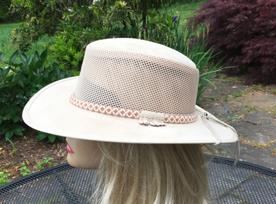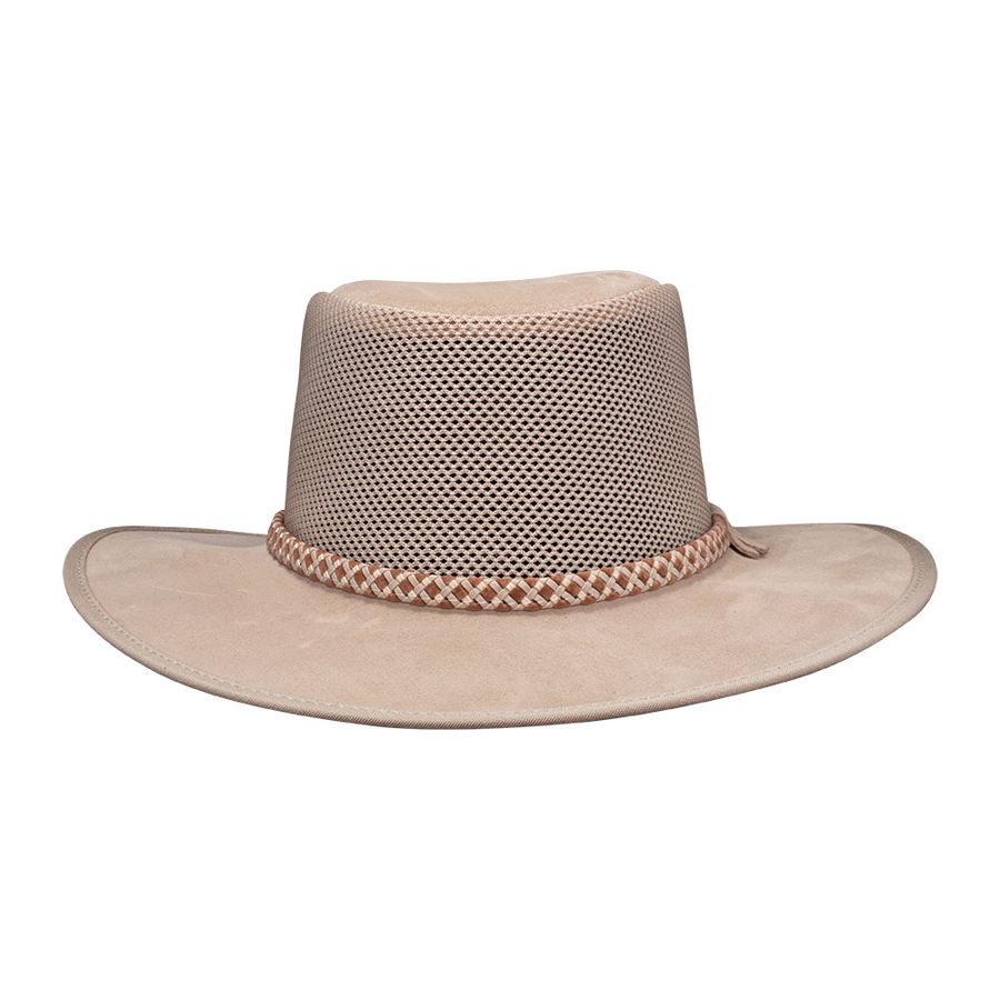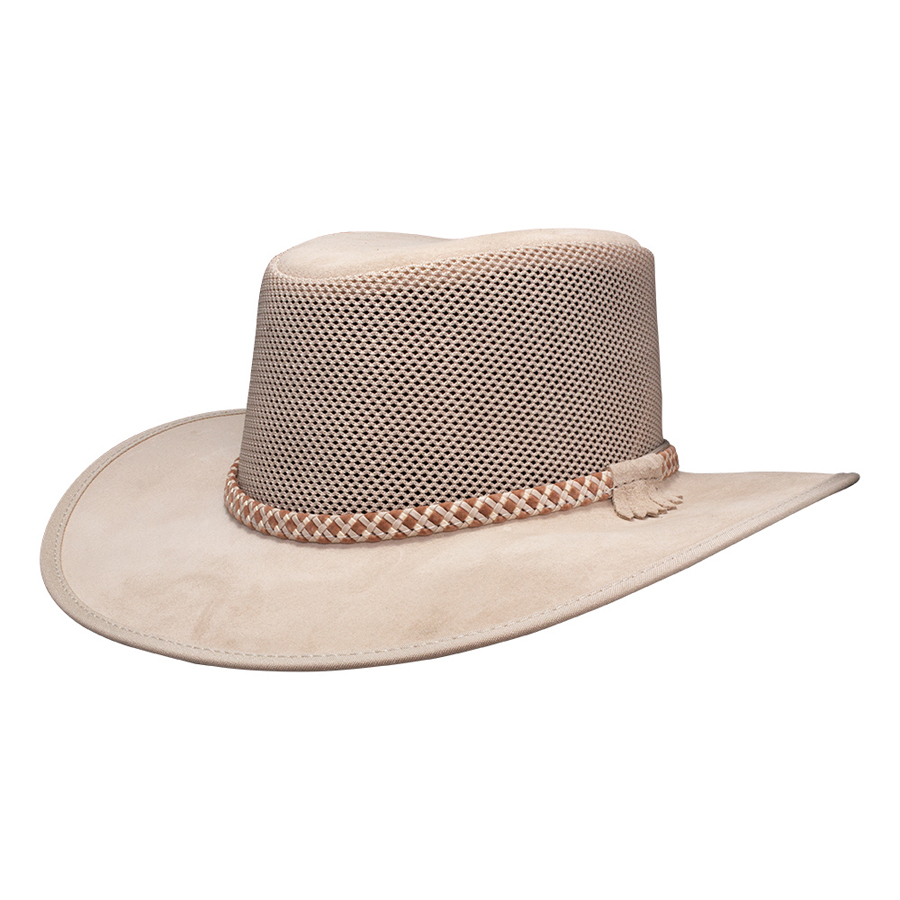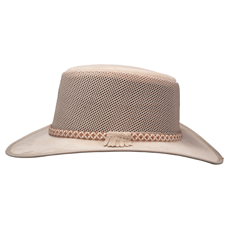 The Breeze in Ivory Suede is one of our favorite Spring/Summer hats. It sports a rich leather brim and top of the crown. Like our other Airflow hats the Breeze allows air to flow in the crown of the hat but protects the top of your head. The chincord can be worn up or down as needed.